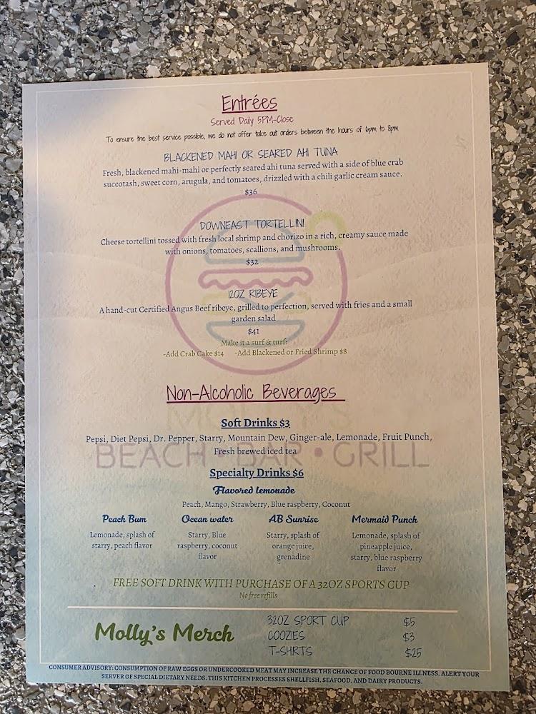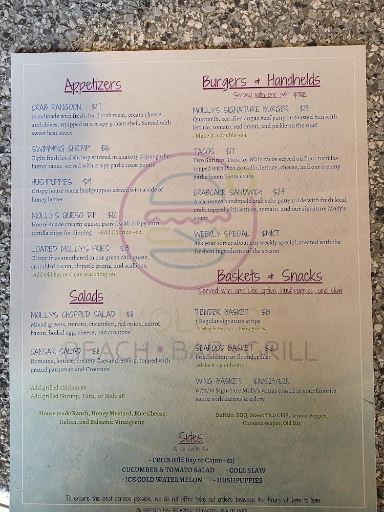 Molly's Beachside Bar & Grill offers a diverse menu with something for everyone. The burgers are certainly a standout. Each burger is made from fresh, local ingredients and is cooked to order. Try the shrimp burger for a twist!
