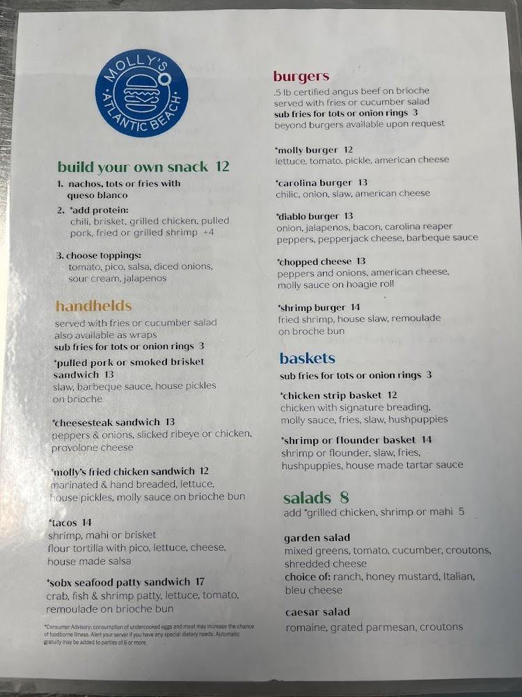 Welcome to Molly's Beachside Bar & Grill, your go-to spot for the best burgers and cold drinks in Atlantic Beach! Located at the DoubleTree by Hilton Oceanfront, we offer a vibrant atmosphere perfect for beach lovers and locals alike. Enjoy our diverse menu featuring mouthwatering burgers, hot dogs, fresh seafood, and vegetarian options. With outdoor seating, takeout, and delivery available, you can savor your meal in the sun or from the comfort of your room. Join us for lunch or dinner, and don’t forget to indulge in our refreshing cocktails! Come experience the ocean breeze and friendly service at Molly's!